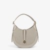 This small sized slim bag has a soft crescent silhouette. The central tab accent ends in a subtle metallic detail. This design is suitable for a relaxed and polished look.